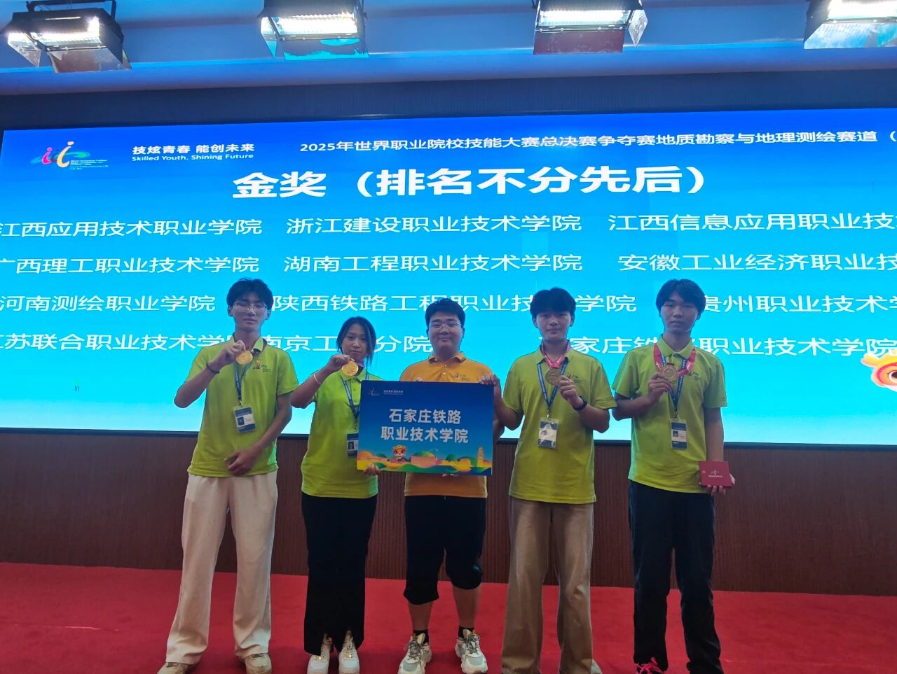 2025年8月25日至30日,世界職業(yè)院校技能大賽總決賽地質(zhì)勘察與地理測繪賽道(高職組)爭奪賽在江西應(yīng)用技術(shù)職業(yè)學(xué)院成功舉行。經(jīng)過激烈角逐,石鐵院測繪工程系王政、信蘇哲、竇甜甜、張旭闊四位同學(xué)組成的參